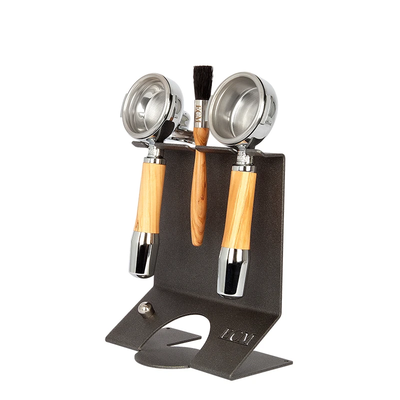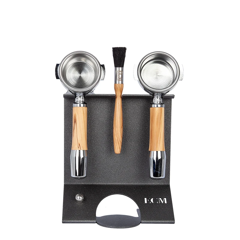Der ECM Accessories Organizer in Anthrazit ist der perfekte Begleiter für alle, die Wert auf eine übersichtliche und geordnete Aufbewahrung ihrer Barista Tools legen. Die Halterung ist vorgesehen für Siebträger, Tamper, Reinigungspinsel und eine Dampfdüse. Für die Siebträger und den Pinsel sind am oberen Ende extra Einkerbungen, die die Tools sicher und griffbereit für den nächsten Einsatz aufbewahren. Am Fußbereich ist ein Loch, welches Platz für eine Dampfdüse hat. Die rechte Seite des Fußes ziert das ECM Logo.