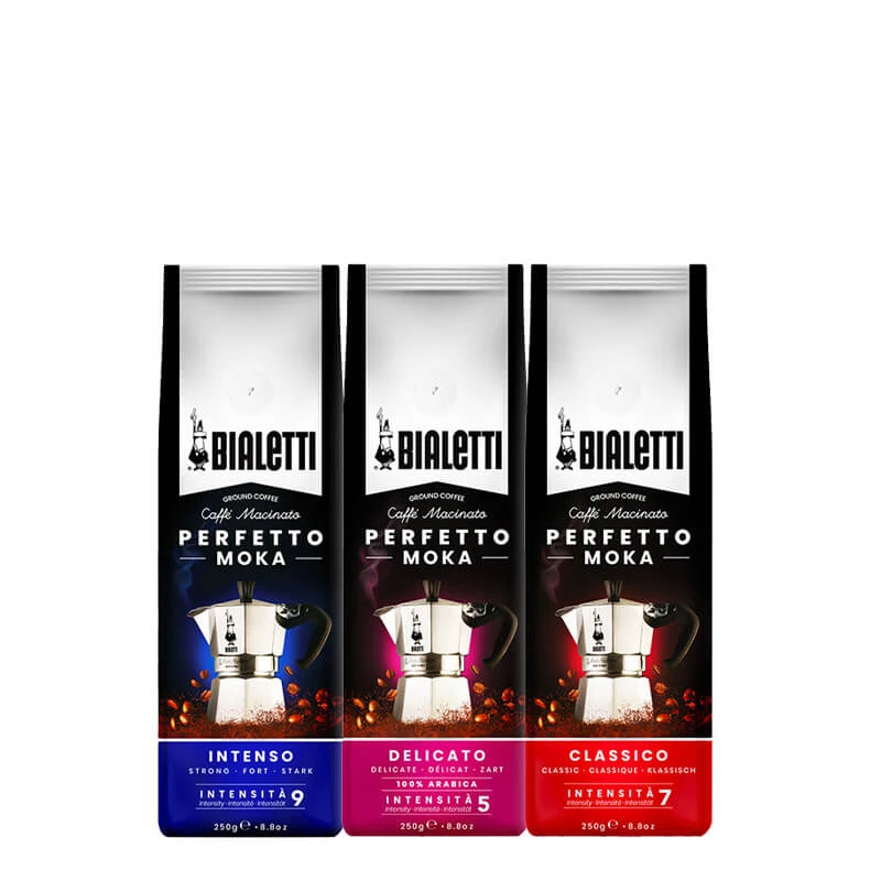 Der Perfetto Moka Intenso von Bialetti besteht zu 70 % aus Robusta Bohnen und zu 30 % aus Arabica Bohnen. Diese wurden in Brasilien und Indien angebaut. Der Blend ist dunkel geröstet. Noten von Kakao harmonieren mit dem Aroma von geröstetem Brot. Insgesamt ein kräftiger, intensiver Moka Genuss.
