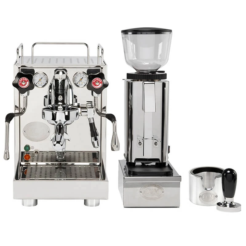 In diesem Bundle haben wir nur das Beste für Sie vereint. Ausschließlich Produkte des Premium-Herstellers ECM für Kaffeezubehör der gehobenen Klasse, sind Bestandteil dieses Bundles. Neben kleinerem Zubehör, wie die neue Version der Tamperstation von ECM, ist die Mechanika V Slim Siebträgermaschine das absolute Highlight dieser Produktzusammenstellung. Für den perfekten Mahlgrad darf selbstverständlich eine elektrische Mühle nicht fehlen. Hier haben wir für Sie die C-Manuale 54 mit passender Sudschublade zum Abklopfen des Siebträgers herausgesucht. Auch optisch bilden die fünf Produkte von ECM eine absolute Einheit, denn das hochwertige Design von poliertem Edelstahl zieht sich durch das gesamte Bundle.