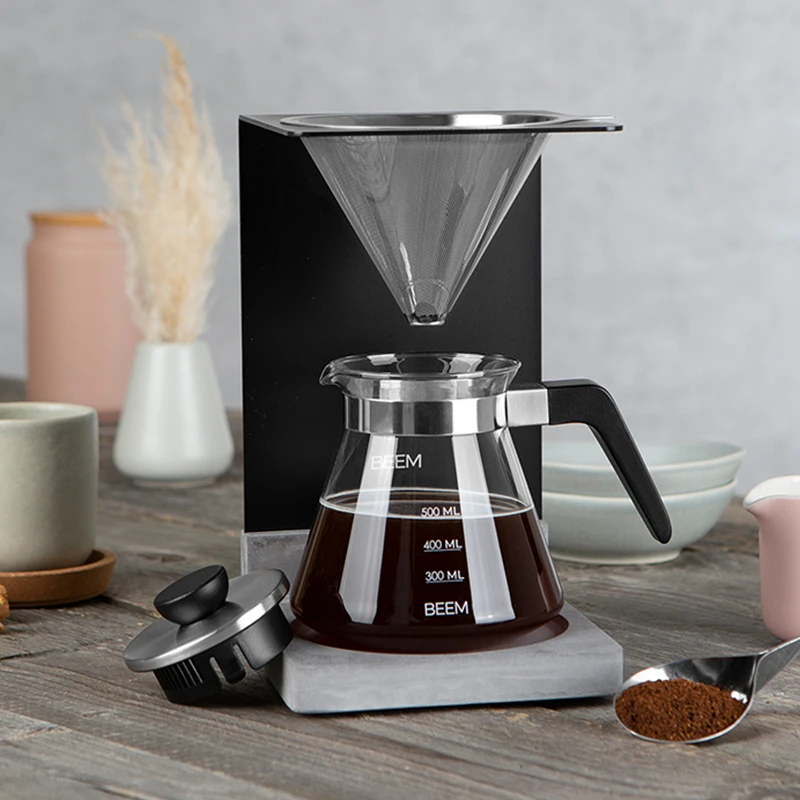 Moderner, stylischer und durchdesignter kann eine Pour Over Maschine wohl kaum sein, als der Kaffeebereiter Beton von BEEM! Der Boden der Pour Over Filtermaschine besteht aus Beton und wirkt dadurch sehr modern und geschmackvoll. Praktisch ist er gleichzeitig auch, da er für einen festen Stand ohne Verrutschen sorgt. BEEM setzt bei der Pour Over Maschine auf modernen Materialmix. Das Gestell besteht aus Aluminium, der Permanentfilter aus Edelstahl, die Kanne aus Glas und Holzelementen. Diese Mischung ist BEEM perfekt gelungen, die Pour Over Maschine wirkt super stimmig und macht Lust auf Design.
