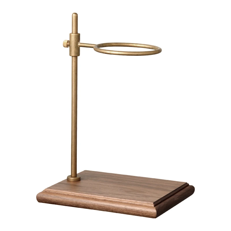 Der Kaffeebrüher Ständer der Slow Coffee Style Specialty Serie von Kinto wird zu einem echten Schmuckstück in Ihrer Küche. Diese Halterung für die Zubereitung von 2 Tassen Filterkaffee ist eine sehr besondere Konstruktion. Der Fuß des Ständers besteht aus einem hochwertigen Walnussholz und geht über in die Halterung aus Edelstahl in Goldoptik. Es handelt sich dabei um von Hand verarbeitetes, hochwertiges Messing aus 18-8 Stainless Steel. Die formschöne Halterung besteht aus einem Stativ, welches höhenverstellbar ist und sich somit an jede Höhe der Karaffe bzw. Tasse in welche der Filterkaffee laufen soll, anpasst. In den großen Ring wird der Brewer mit einem Papier- oder Edelstahlfilter eingespannt, in welchen anschließend der Kaffeesatz gefüllt wird. Nachdem heißes Wasser aufgegossen worden ist, kann der Filterkaffee durchlaufen und Ihnen einen wunderbaren Start in den Tag ermöglichen.